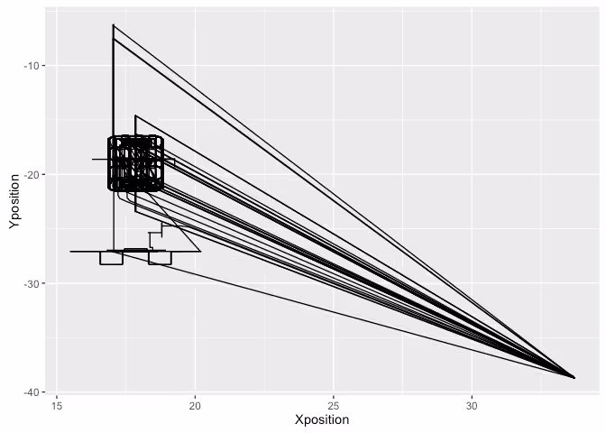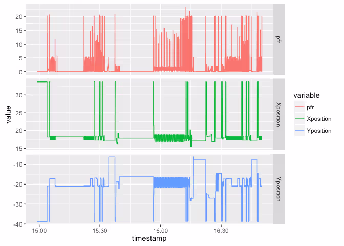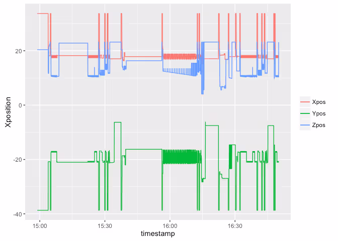 It looks like we have the position data items that we might need for this analysis in the log data. Let's see the variation in position. We can plot all the data items in one plot using ggplot2.