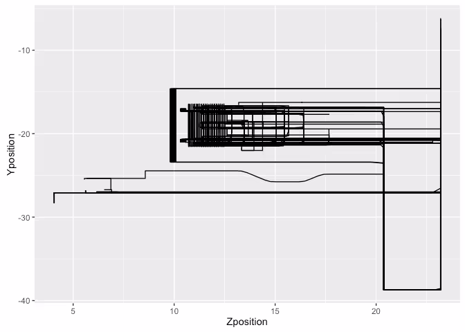 It does look the sudden traverals are simultaenous across the axes. Plotting one axes against the other leads to the same conclusion. It also gives us an idea of the different representations of the part